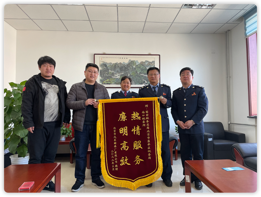 2022年3月7日,北京市汽車解體廠將一面印有“熱情服務(wù),廉明高效”的錦旗送到昌平區(qū)稅務(wù)局南口稅務(wù)所。對(duì)南口稅務(wù)所一直以來對(duì)我企業(yè)熱情周到、廉明高效的服務(wù),我企...