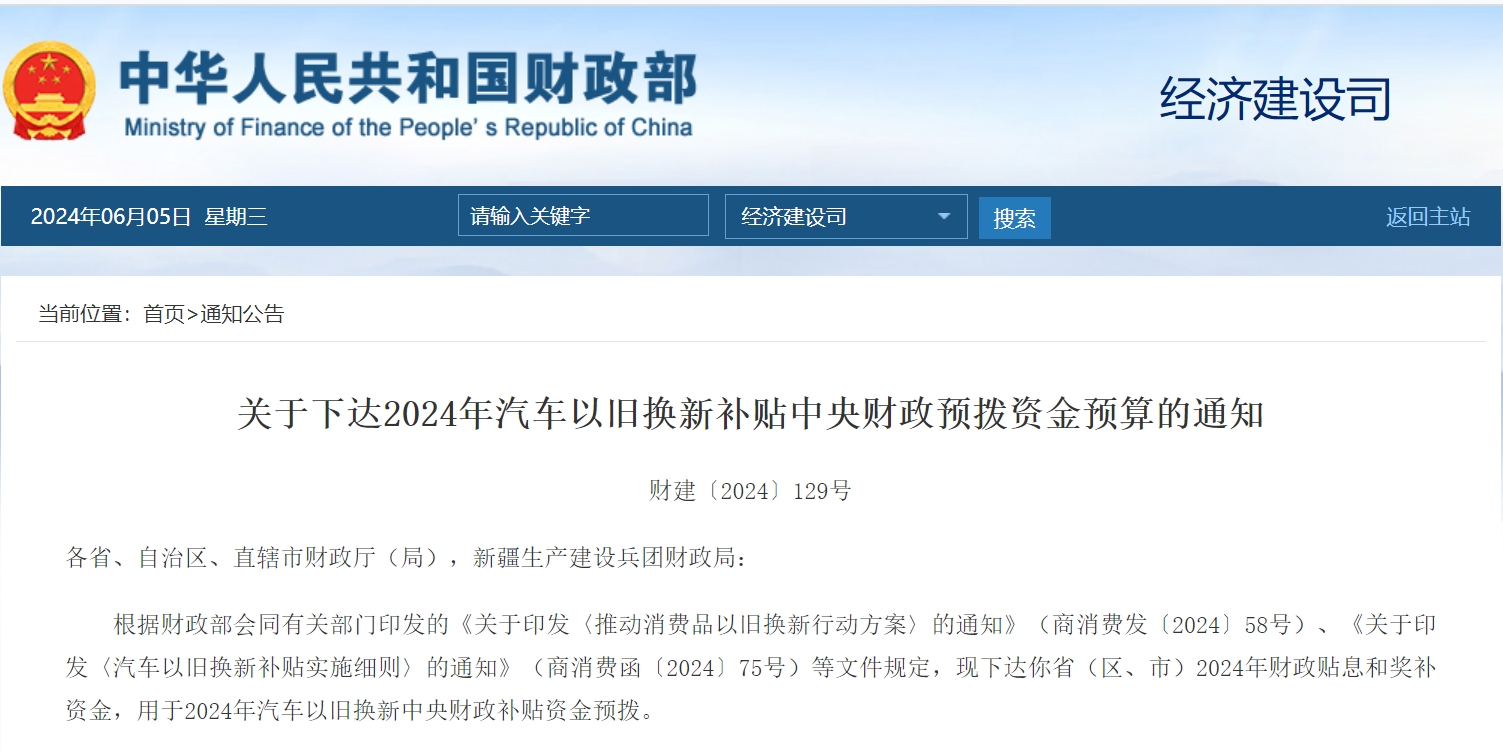 財政部關(guān)于下達(dá)2024年汽車以舊換新補貼******財政預(yù)撥資金預(yù)算的通知