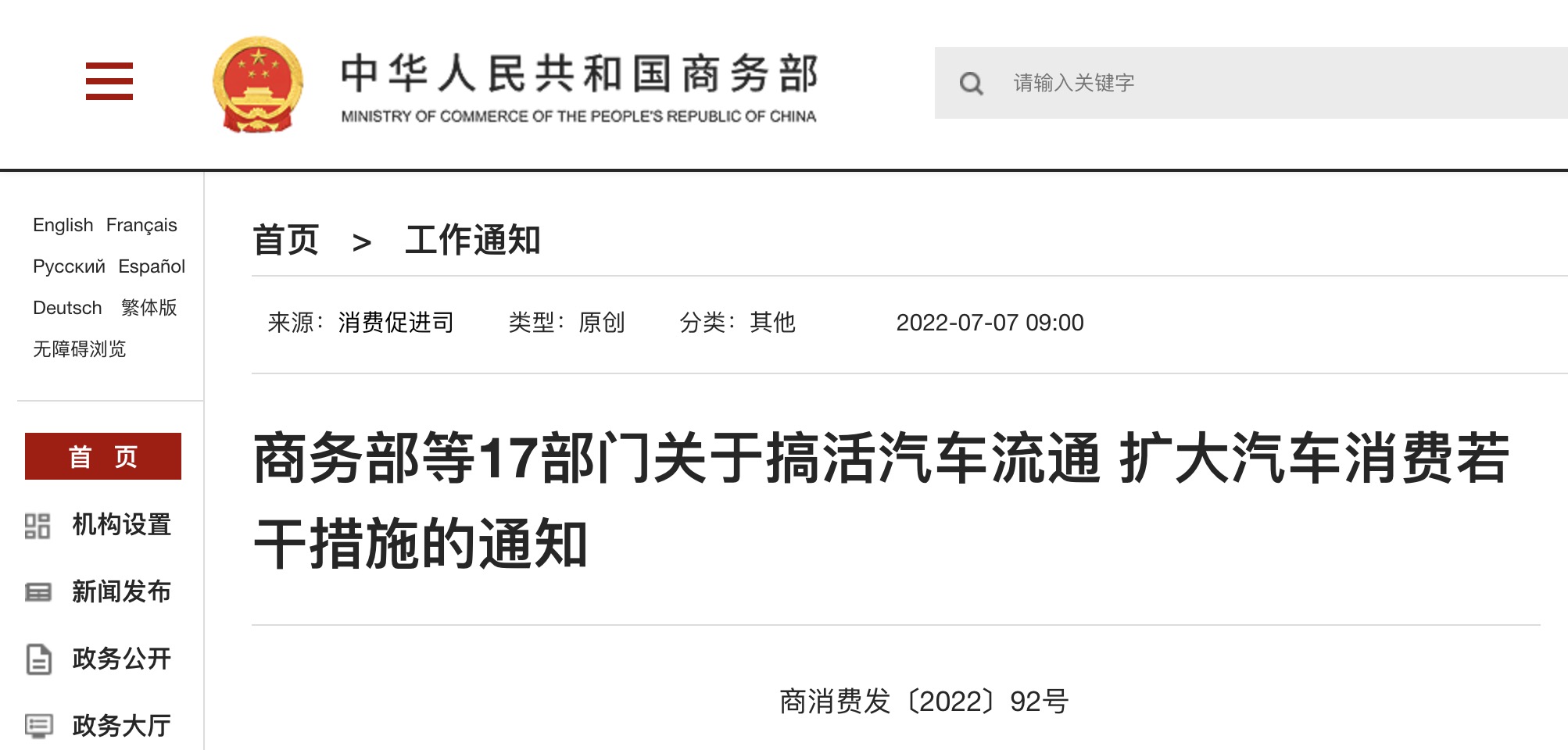 商消費(fèi)發(fā)〔2022〕92號(hào)各省、自治區(qū)、直轄市人民政府,新疆生產(chǎn)建設(shè)兵團(tuán):汽車(chē)業(yè)是國(guó)民經(jīng)濟(jì)的戰(zhàn)略性、支柱性產(chǎn)業(yè)。為進(jìn)一步搞活汽車(chē)流通,擴(kuò)大汽車(chē)消費(fèi),助力穩(wěn)定經(jīng)濟(jì)...