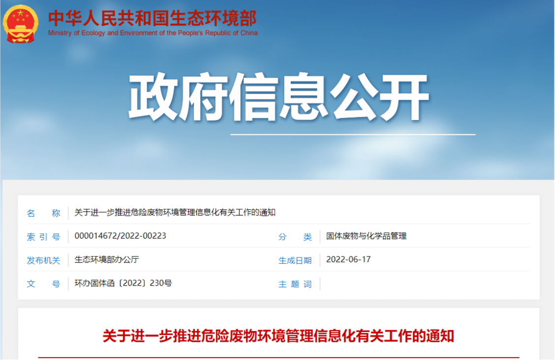 生態(tài)環(huán)境部關(guān)于進(jìn)一步推進(jìn)危險(xiǎn)廢物環(huán)境管理信息化有關(guān)工作的通知各省、自治區(qū)、直轄市生態(tài)環(huán)境廳(局),新疆生產(chǎn)建設(shè)兵團(tuán)生態(tài)環(huán)境局:為貫徹落實(shí)《中華人民共和國(guó)固體廢物...