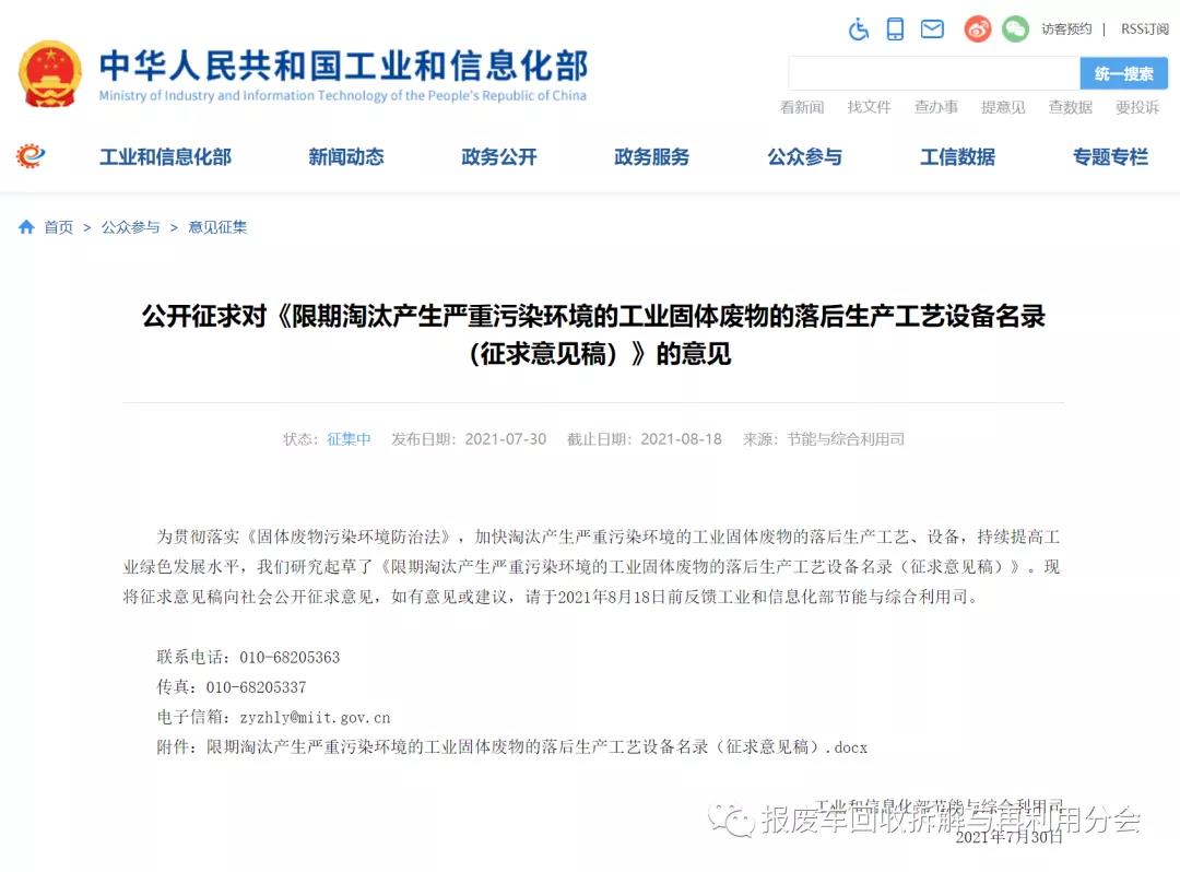 公開征求對(duì)《限期淘汰產(chǎn)生嚴(yán)重污染環(huán)境的工業(yè)固體廢物的落后生產(chǎn)工藝設(shè)備名錄(征求意見稿)》的意見