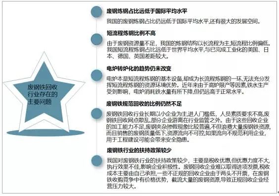 廢鋼鐵回收行業(yè)存在的主要問題有:廢鋼煉鋼占比遠低于國際平均水平、短流程煉鋼比例不高、電爐轉(zhuǎn)爐化的趨勢仍未改變、廢鋼鐵規(guī)范回收的比例仍然不足、廢鋼鐵行業(yè)的扶持政策較少等問題。