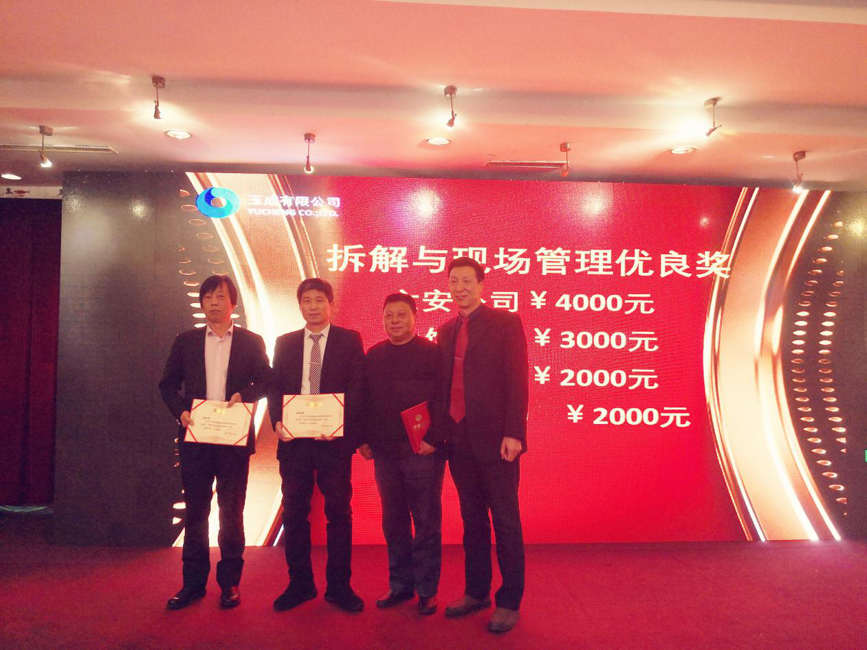 此次年會(huì),公司設(shè)置了回收優(yōu)良獎(jiǎng)、回用件銷售優(yōu)良獎(jiǎng)、拆解與現(xiàn)場管理優(yōu)良獎(jiǎng)、設(shè)備管理優(yōu)良獎(jiǎng)、Z值優(yōu)良獎(jiǎng)、費(fèi)用控制優(yōu)良獎(jiǎng)、經(jīng)營改善獎(jiǎng)、F值-利潤優(yōu)良獎(jiǎng)等8個(gè)集體獎(jiǎng)項(xiàng)和14個(gè)個(gè)人獎(jiǎng)項(xiàng),現(xiàn)場表彰并獎(jiǎng)勵(lì)了2018年度在各業(yè)務(wù)環(huán)節(jié)中表現(xiàn)突出的公司和******員工,獲獎(jiǎng)員工紛紛感言,表示要在新的一年里繼續(xù)努力,扎實(shí)工作,為公司的進(jìn)步和發(fā)展做出自己新的更大的貢獻(xiàn)。
