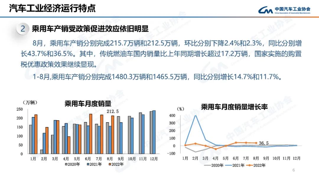 2022年8月,汽車產(chǎn)銷同比延續(xù)保持快速增長勢頭,購置稅優(yōu)惠等促消費政策持續(xù)發(fā)力,乘用車消費企穩(wěn)上升,即使經(jīng)濟(jì)運行有波動,消費依然堅韌,已逐步恢復(fù)到正常狀態(tài);商用車產(chǎn)銷實現(xiàn)今年以來首次同比增長;本月新能源汽車產(chǎn)銷、汽車出口同比均創(chuàng)歷史新高。